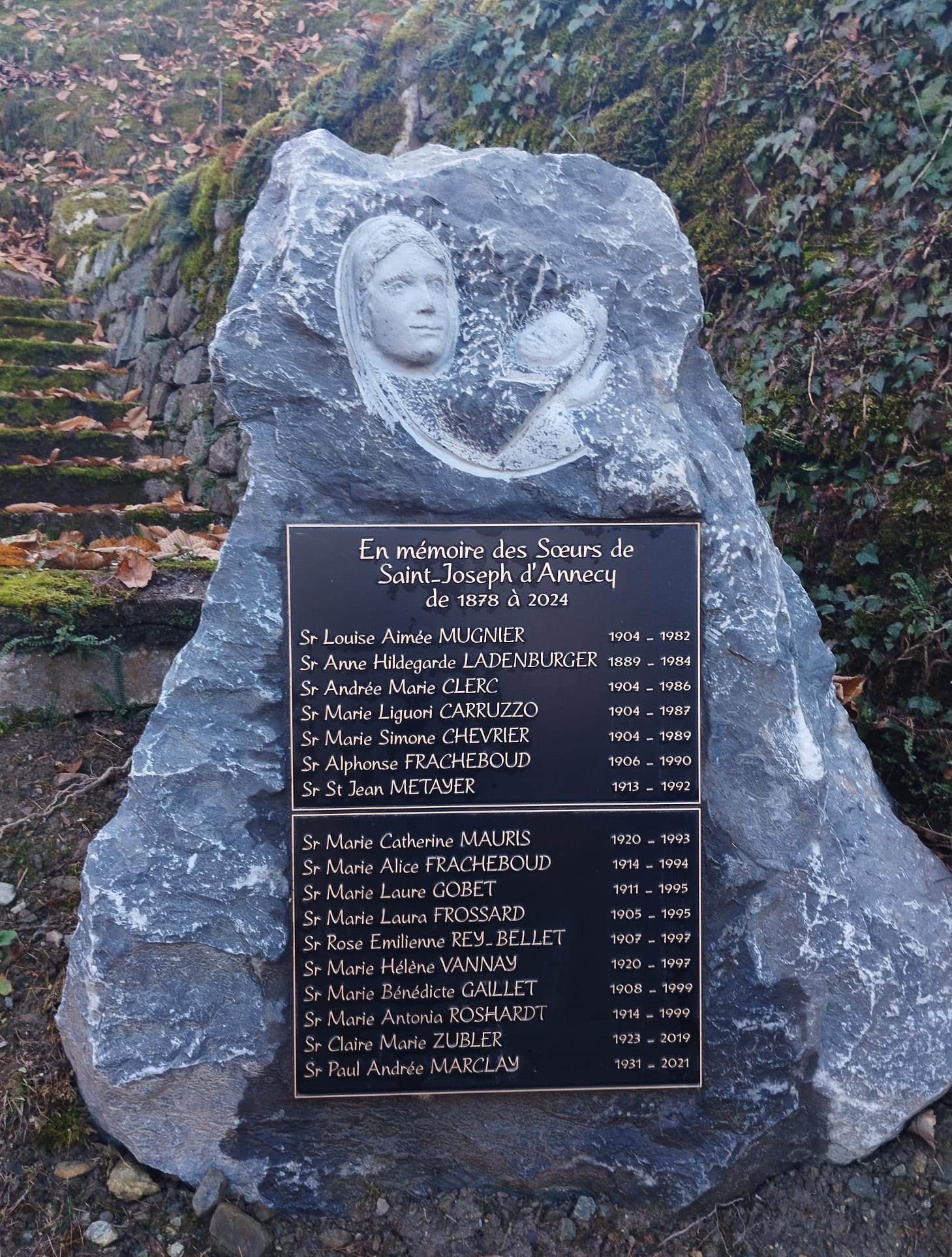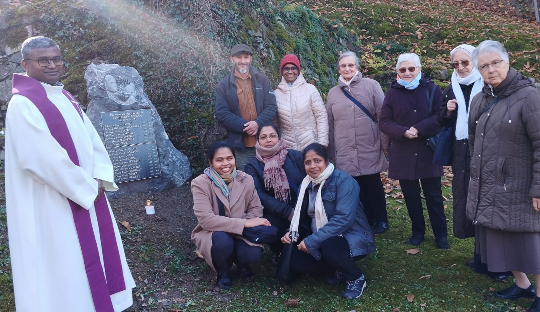 Le 17 novembre, nous étions une vingtaine à voyager d’Annecy à Monthey, en Suisse, pour honorer nos Sœurs défuntes. Avant que la communauté de Monthey ne soit officiellement fermée le 15 juillet 2024, Sœur Claude et les Sœurs avaient exprimé un profond désir de créer quelque chose de durable pour commémorer toutes celles qui avaient vécu et servi en Suisse. En réponse à ce souhait profondément ressenti, Sœur Tessy et son équipe ont proposé une belle initiative : l’installation d’une pierre commémorative portant les noms de toutes nos Sœurs qui avaient œuvré en Suisse.
