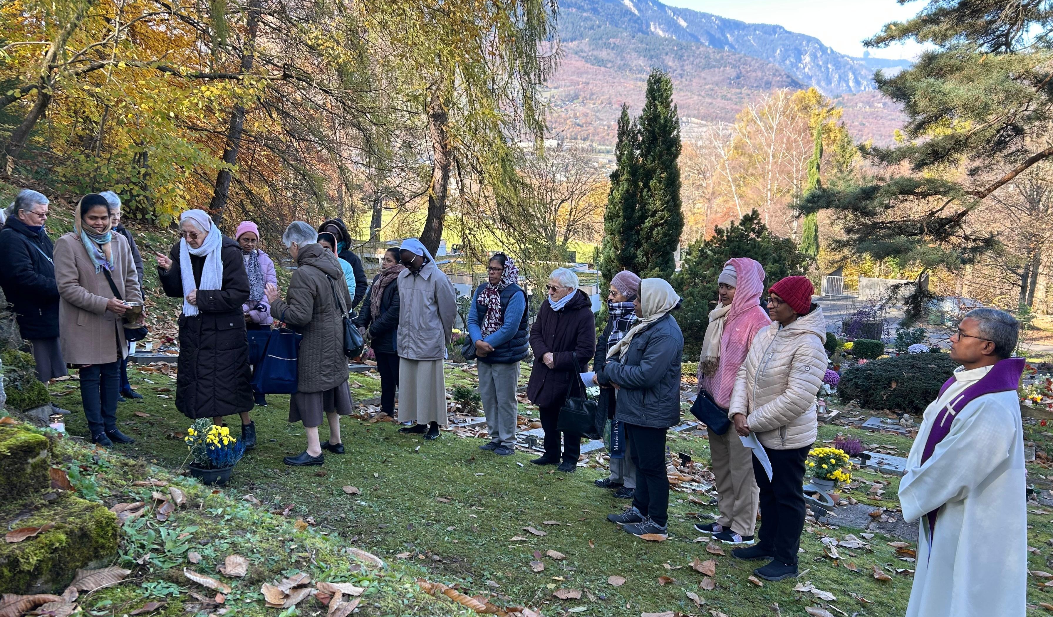 Le 17 novembre, nous étions une vingtaine à voyager d’Annecy à Monthey, en Suisse, pour honorer nos Sœurs défuntes. Avant que la communauté de Monthey ne soit officiellement fermée le 15 juillet 2024, Sœur Claude et les Sœurs avaient exprimé un profond désir de créer quelque chose de durable pour commémorer toutes celles qui avaient vécu et servi en Suisse. En réponse à ce souhait profondément ressenti, Sœur Tessy et son équipe ont proposé une belle initiative : l’installation d’une pierre commémorative portant les noms de toutes nos Sœurs qui avaient œuvré en Suisse.